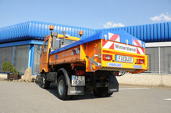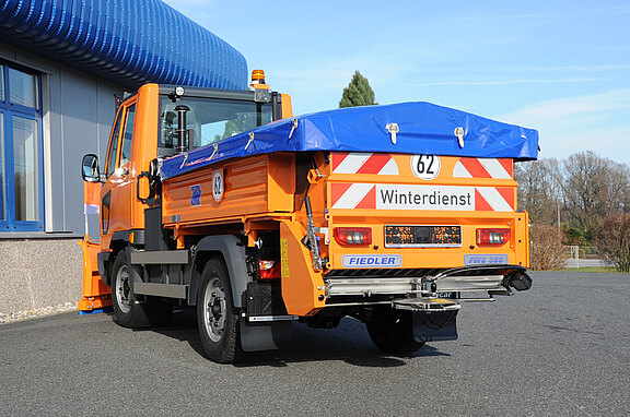 Красная / белая предупредительная разметка на отражающей фольге с надписью «Зимняя уборка» в соответствии с DIN 30710 / StVZO дополнительно: - рама из дуг с тентом грузовой машины - полностью автоматизированное управление в зависимости скорости